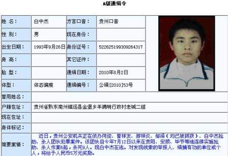 簡介:今年8月2日,公安部發(fā)布A級通緝令,懸賞5萬元緝拿在逃犯罪嫌疑人白中杰,他涉嫌參與一個搶劫、殺人團(tuán)伙。該團(tuán)伙自今年7月12日以來,在貴陽、安順、畢節(jié)等地連續(xù)實(shí)施搶劫、殺人作案6起,殺死9人。在公安部網(wǎng)站上自2006年1月26日以來公布的25個A級通緝令通緝的犯罪嫌疑人中,白中杰是年齡最小的,是唯一的“90后”。8月4日白中杰被警方抓獲。