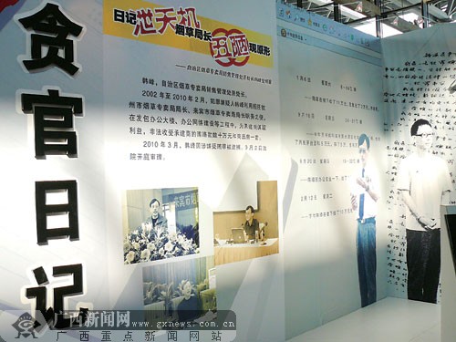 展廳中引人矚目的,是曾“名噪一時”的自治區(qū)煙草專賣局原銷售處處長、來賓市煙草專賣局原局長韓峰!叭沼浘珠L”也進(jìn)入展覽,引來眾人圍觀。