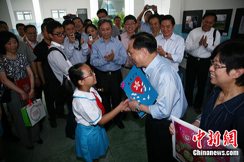 曾蔭權在四川省委書記劉奇葆的陪同下先后參觀了東方汽輪機有限公司新基地、東汽醫(yī)院、康復及假肢中心,以及德陽市第一小學。他仔細問詢因地震致殘病人的恢復情況,與小學生親切合影。