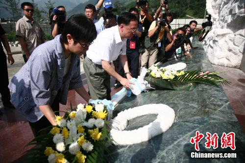 隨后,曾蔭權一行來到漩口中學地震遺址。烈日下,曾蔭權肅立默哀,向汶川大地震遇難者和在抗震救災中英勇犧牲的烈士三鞠躬,獻花祭奠。