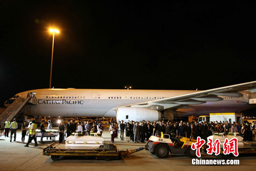 中新社香港8月25日電(梁今 胡娜 梁君艷)在菲律賓劫持人質(zhì)事件中八位香港遇難者的靈柩,25日晚由港府包機從馬尼拉送返香港。