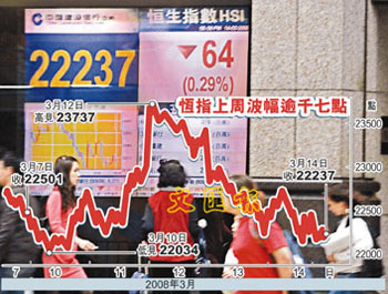 港股ADR中,跌幅最大的為國壽,其ADR折合價(jià)為26.87元,較港股周五收市跌3.1%,匯控與聯(lián)通也跌2.4%至2.45%。高信投資行政總裁沈慶洪認(rèn)為,貝爾斯登的財(cái)困情況,未必是單一例子,類同事件或會繼續(xù)爆發(fā),故18日港股將下試今年低位21709點(diǎn),其后在減息刺激下,或會稍為回穩(wěn),但本周末段時(shí)間,仍有機(jī)會再度下試21100低位后,恒指的調(diào)整才有機(jī)會喘定。