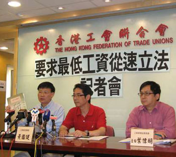 工資保障運(yùn)動(dòng)推行超過年半以來成效不彰,立法規(guī)管最低工資似乎勢在必行。工聯(lián)會(huì)理事長黃國健、立法會(huì)議員王國興和權(quán)益委員會(huì)主任葉偉明9日一同召開記者會(huì),公布該會(huì)研究部就立法規(guī)管最低工資的研究結(jié)果。