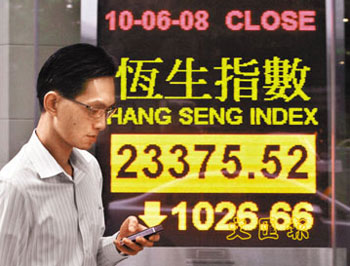 港股10日低開700多點(diǎn)后持續(xù)下瀉,午市后隨內(nèi)地A股跌幅加深,續(xù)擴(kuò)大至逾千點(diǎn),并以接近全日低位收市,大跌1026.6點(diǎn)或4.21%,收?qǐng)?bào)23375.5點(diǎn),是3個(gè)月來最大點(diǎn)數(shù)跌幅,成交大增39%至821.5億元。