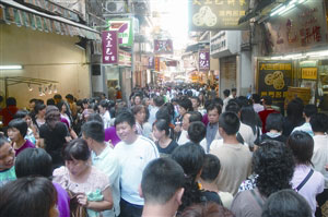 圖:澳門大三巴手信街擠滿游客。(圖片來源:澳門日報)
