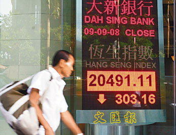 港股9日未能延續(xù)周一勁升860點(diǎn)的強(qiáng)勢,就算美股高收近300點(diǎn),恒指也跟隨亞洲區(qū)股市下跌,剛開市已跌355點(diǎn),最多跌近500點(diǎn),下午跌勢喘定,收報(bào)20491點(diǎn),跌303點(diǎn),成交額比周一大減200億元至479.5億元。