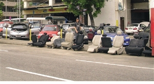 將座椅地氈?jǐn)[車(chē)頂、路邊,成修車(chē)行一帶新景觀。(圖片來(lái)源:澳門(mén)日?qǐng)?bào))