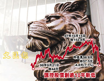匯控單日急挫7.7%,圖表顯示其有跡象下試50元以下水平,但白韌認(rèn)為,匯控跌穿60元已經(jīng)接近底部,雖然匯控表示沒有財(cái)政壓力,但卻受制于市場,若早些宣布集資,反而可掃除其不明朗因素。7天以來匯控股價(jià)已下跌23%,市值因而蒸發(fā)2062億元。