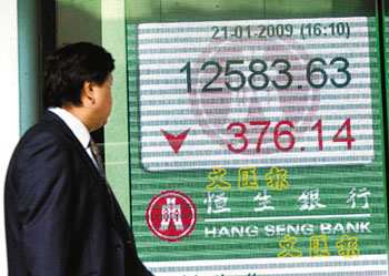 中新網(wǎng)1月22日電 據(jù)香港《文匯報》報道,21日港股承接美股大跌332.13點的勢頭,在匯控被力沽及國壽受盈警拖累股價下挫7.5%的情況下,恒生指數(shù)收市下跌376.14點至12,583.63點,其跌幅為2.9%,不算太大。