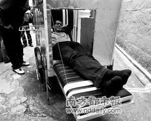 記者在策展人鐘宏亮引領(lǐng)下參觀了整個展覽,發(fā)現(xiàn)了不少充滿新意的作品。在女子監(jiān)獄外的名為《工作/空間/再工作/時間》的作品儼然一棟房子,但全部由一塊塊黑色薄木板拼建成,透過木板間的間隙可以看到建筑里的人在活動,而整個建筑又相當(dāng)結(jié)實,人可以從“樓梯”登上房子的二樓。名為《流浪家居》的作品,作者甚至設(shè)計了一輛“房車”,不過是流浪者的“房車”,由自行車帶動,“房車”麻雀雖小,五臟俱全,里面有窗有門,有柜子有凳子,通過拼接還可以組成一張床,作者現(xiàn)場向大家講解時還興奮地拼起床躺了下來。(馮悅)