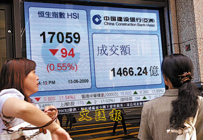 中新網(wǎng)5月14日電 據(jù)香港《文匯報(bào)》報(bào)道,建行遭美銀減持解禁股13日悉數(shù)上板,加上再傳有投資者配售建行舊股,在有關(guān)消息拖累下,建行全日捱沽,而匯控在連升9天下回吐,拖累港股先升后跌。港股13日再度受制于250天線牛熊分界線,高位回吐近300點(diǎn),全日倒跌94點(diǎn),報(bào)17059.6點(diǎn)。