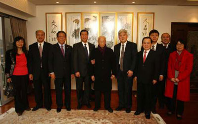 24日香港寒風(fēng)凜凜,但國學(xué)大師饒宗頤位于跑馬地的居所愛賓室里,卻洋溢著暖暖春意。陳進(jìn)玉一行帶著溫家寶總理和國務(wù)委員馬凱的新春祝福,以及親筆簽名的新春賀卡,在傳統(tǒng)新春佳節(jié)到來前夕,專程來港探望饒宗頤。小小會客室賓朋滿座,歡聲笑語不絕于耳,與墻上的饒老得意之作愛賓室題字相映成趣。