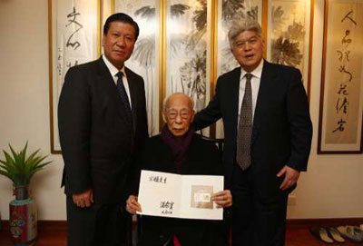 陳進(jìn)玉代為轉(zhuǎn)交這份千里之外的濃濃祝福,饒老接在手中,凝神細(xì)望,若有所思,笑得開懷:“虎年,好年”。陳進(jìn)玉轉(zhuǎn)達(dá)了溫總理的新春問候。他說,饒宗頤先生為弘揚(yáng)中華民族優(yōu)秀傳統(tǒng)文化、促進(jìn)國家文化建設(shè)提出了許多寶貴意見。去年初饒老獲溫總聘任,擔(dān)任中央文史研究館館員,當(dāng)?shù)弥埨媳M管年事已高,仍關(guān)注國家文化建設(shè)時(shí),溫總深受感動,也十分關(guān)心饒老的健康和生活,百忙之中,仍將饒老安康緊系心頭。