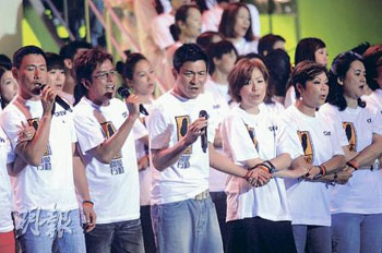 嫁給臺灣富商鄭翔中后,移居當?shù)?3年的前港姐李美鳳,不單捐出一對子女的利是錢,更即場除下手上的價值10多萬的鉆石表義賣。愛心是無價的,所以她不設(shè)底價。鄭秀文與劉德華合唱《喝彩》,她說:“天災(zāi)無法避免,人類好渺小,要正面態(tài)度去面對,要帶著勇氣活下去,黑暗過后一定有陽光!”還有藝人狄波拉、陳奕迅、方力申、劉璇等,也充當接線生出力籌款。