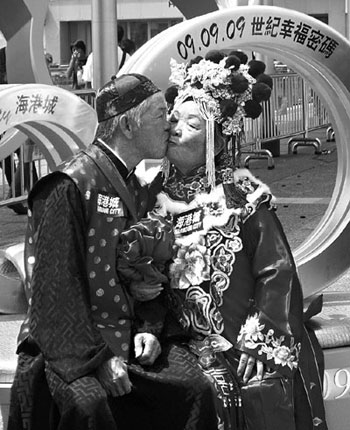 9月8日,六對(duì)夫婦與情侶身穿中西結(jié)婚禮服,一起親吻作愛的見證。為與天下有情人在09年9月9日(09.09.09)這世紀(jì)一遇的“長(zhǎng)長(zhǎng)久久”日子共度最浪漫時(shí)刻,香港海港城特別在當(dāng)日舉行宣傳活動(dòng)。 中新社發(fā) 譚達(dá)明 攝