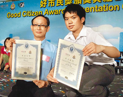 18日共有40名好市民得獎(jiǎng),15歲的容啟聰為最年輕的得獎(jiǎng)?wù)。本?月,他參加運(yùn)動(dòng)會(huì)時(shí)發(fā)現(xiàn)一名可疑男子把一些手袋放到運(yùn)動(dòng)場(chǎng)外的私家車上,懷疑他偷去同學(xué)的財(cái)物,于是立即通知老師胡文安,并與胡一起追截該男子。該男子其后駕車逃去,他們立即記下其車牌號(hào)碼及報(bào)案。