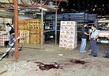 事發(fā)在22日晚約10時,2名男子與一批人在果欄談判,其后起爭執(zhí),2名男子被多人持刀追砍,身受重傷,其中1人其后死亡,另1人左手手腕和左腰有刀傷,敷藥后已經(jīng)出院。