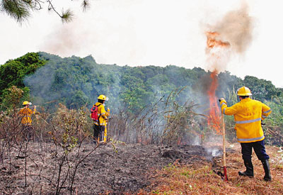 中新網(wǎng)10月27日電 據(jù)香港《文匯報》報道,不少香港市民趁26日重陽節(jié)到各區(qū)墳場掃墓,適逢天文臺發(fā)出黃色火災(zāi)危險警告,以致山火頻發(fā)。消防處26日接獲32宗山火報告,雖無人受傷,但消防員疲于奔命,帶備火拍及背泵上山撲火。由于山火眾多,港府飛行服務(wù)隊直升機也頻頻出動,空投水彈協(xié)助救火。