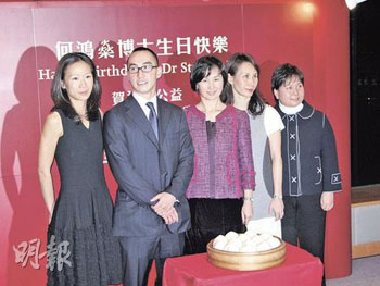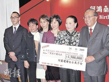 四太大女何超盈手持寫上“Happy Birthday 掂呀!”的巨型生日卡賀老父,四太則用手做出心形手勢表示送個心給賭王。二太藍(lán)瓊纓則率領(lǐng)三女一子何超瓊、何超鳳、何超蕸及何猷龍出席“賀禮捐公益”活動,代表賭王將一張150萬元的支票捐贈公益金,并透露賭王進(jìn)展良好,但仍未可出院,要在醫(yī)院度生辰。