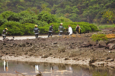 消防員趕至,帶備木板和鐵鏟往救人,步出10多米后已身陷泥灘,10多名消防員遂改以匍匐前進(jìn)方式靠近,花約1小時終掘開兩名事主身邊瘀泥,將他們救出帶回路邊。兩名事主無受傷,但與消防員一樣滿身泥濘,要出動消防喉沖洗身體,及后自行離開。