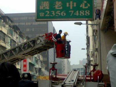 土瓜灣馬頭圍道一幢樓宇整幢倒塌,消防員架起云梯從旁邊大廈救出被困居民。消防員首先為居民綁上安全帶,然后逐個居民由云梯救落地面。