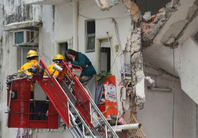 同樣是住在塌樓現(xiàn)場毗鄰危樓的王先生,從事裝修工程,同樣被這驚天場面嚇至目定口呆,事后仍全身發(fā)抖,只能由聞訊趕往助援的同事,簡述逃命經(jīng)過。