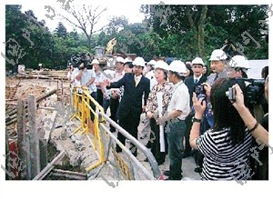 陳麗敏、譚偉文等昨日視察石排灣郊野公園熊貓館建館情況。譚偉文表示,建館工程進度理想,正全力趕工完成基礎(chǔ)土建部分,接著會展開上蓋部分。由于已進入雨季和臺風(fēng)季節(jié),有關(guān)承建單位已作好防風(fēng)雨的準備工作,盡量減低天氣對工程的影響。以目前情況來看,相信可爭取九月前完成整項工程。