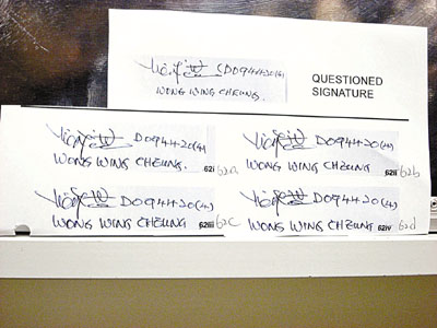 龔家證人上周作供完畢,法庭15日開(kāi)始傳召專(zhuān)家證人作供。華懋慈善基金傳召的英國(guó)筆跡專(zhuān)家Robert Radley,分析王永祥提供的35個(gè)簽名樣本,其中20個(gè)是王永祥特意為案件而簽,其余15個(gè)則是他于1995年至2007年文件中的簽名。Robert Radley將簽名樣本跟“06遺囑”中的簽名比較,發(fā)現(xiàn)有10多個(gè)不同處,他15日在法庭內(nèi)利用顯微鏡及投射機(jī),將不同處逐個(gè)投射到大熒幕解釋。