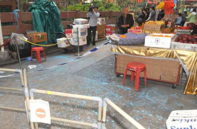 中新網(wǎng)3月15日電 據(jù)香港《大公報》報道,香港柴灣道一間水果攤因拒交“陀地”費5年來頻被黑幫滋擾,患癌店東受刺激致病情惡化去世,遺孀和兩子接手后滋擾仍未間斷,14日晨店鋪開業(yè)時,被兩名惡漢突然走近潑淋藍(lán)色油漆,少東走避不及輕微濺中,另一名街坊婆婆經(jīng)過也中招,幸有驚無險。