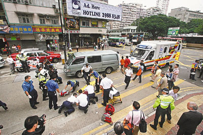 另外,一對來港探親、上了年紀的內地姐弟,昨天上午11時45分在旺角染布房街近亞皆老街交通燈路口橫過南行線馬路時,1輛沿亞皆老街東行客貨車右轉入染布房街,弟及時閃避, 68歲陸姓老婦卻被客貨車撞個正著,當場飛彈數呎倒地,頭破血流昏迷,送院情況危殆。肇事客貨車黃姓30歲司機事后在場助查,警方正調查是否有人不遵照交通燈號導致意外。