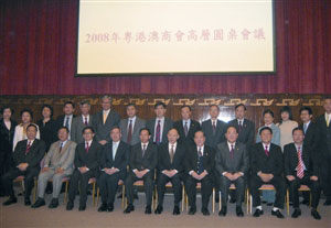 “2008年粵港澳商會高層圓桌會議”由香港中華總商會副會長林銘森主持。在會議上發(fā)言的還有:香港中華總商會會長霍震寰、廣東省總商會會長陳丹、香港工業(yè)總會主席陳鎮(zhèn)仁等。