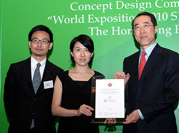 圖:政務(wù)司司長(zhǎng)唐英年(右)頒發(fā)冠軍狀予“無(wú)限空間”設(shè)計(jì)者。(圖片來(lái)源:香港特區(qū)政府網(wǎng)站)