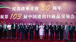 由廣州市工商聯(lián)、市總商會、市外商投資企業(yè)商會、市民營企業(yè)商會共同主辦的“紀(jì)念改革開放30周年暨慶祝第103屆中國進(jìn)出口商品交易會開幕宴會”,14日在廣州白云國際會議中心舉行。廣州市長張廣寧,市委副書記蘇志佳,市委常委、統(tǒng)戰(zhàn)部長孔少瓊等,以及粵港澳商界代表逾1000人出席。