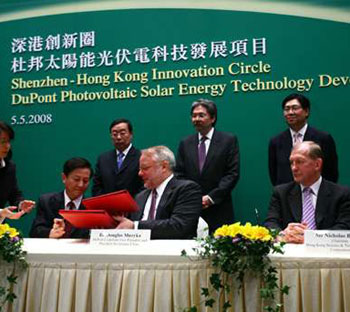 中新網(wǎng)5月6日電 據(jù)香港文匯報報道,“深港創(chuàng)新圈”引入首個港深聯(lián)手的高新科技研發(fā)生產(chǎn)項目。位居全球500強的美國杜邦公司5日與香港科技園公司和深圳市政府代表簽署合作意向書,在港深分別設(shè)立太陽能研究及產(chǎn)業(yè)平臺。