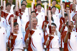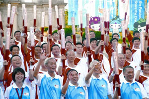 澳門火炬手展?fàn)N爛笑容 大合照贈(zèng)北京奧組委(圖)