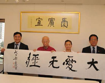 在這個“愛心書畫義賣區(qū)”內(nèi),最矚目的是國學(xué)大師饒宗頤教授親筆所寫的“大愛無疆”,這四個大字已被香港潮屬總會名譽(yù)會長高佩璇居士以500萬港元義購,可謂一字百萬金。在這里,最珍貴的不是這些字,也不是這筆捐款,而在于它帶來的情感上的震撼,一種骨肉相連、發(fā)自肺腑的真情。