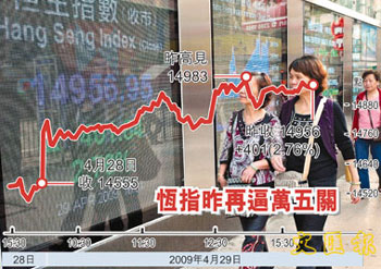 中新網(wǎng)4月30日電 據(jù)香港《文匯報》報道,市場憧憬國務(wù)院宣布將上海建設(shè)成國際金融中心及航運中心的細節(jié),A股29日午市急升近3%,刺激香港中資股升幅擴大,令港股在豬流感陰霾下連跌2天后終見反彈,于29日期指結(jié)算日被挾高,以接近全日高位收市,收報14956.9點升401.8點,總成交508億元。