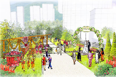 “姻園”的設(shè)計(jì)和布置都圍繞婚嫁這一主調(diào),并提供約30,000平方呎凈樓面的零售用地。除了喜帖店鋪,該處還提供與婚嫁有關(guān)的商品和服務(wù),包括婚紗、禮服、鮮花、禮餅、發(fā)型屋、珠寶首飾、影樓、房車(chē)租賃、婚宴舞會(huì)統(tǒng)籌服務(wù),以及場(chǎng)地布置等。毗連“姻園”的部分空地也有切合婚嫁主題的裝飾布置和藝術(shù)雕塑品擺設(shè)。