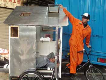 中新網(wǎng)1月4日電 露宿者流離失所,受城市發(fā)展所逼欲找尋“有瓦遮頭”暫住亦難度甚大。理大設(shè)計(jì)學(xué)院環(huán)境及室內(nèi)設(shè)計(jì)系助理教授黃國才就設(shè)計(jì)了一車多用的“流浪三輪車屋”,內(nèi)里可居住、閱讀及保管財(cái)物,除令露宿者有藏身之所外,亦方便他們踏著三輪車尋找每日不同的居住地方。