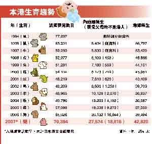 據(jù)香港明報報道,2007年醫(yī)管局共錄得39,182名新生嬰數(shù)字,醫(yī)管局總行政經(jīng)理鄭信恩說,雖然傳統(tǒng)上生仔旺季一向在9月至11月,但今年首個半月公立醫(yī)院生產(chǎn)個案,已明顯較去年同期上升,“去年經(jīng)濟好,市民積極想生育多點,估計今年生育也會多,新生嬰應會超過去年!