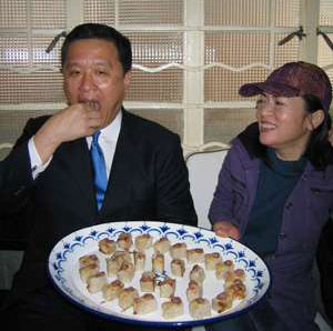 圖:在灣仔船街18號(hào)經(jīng)營(yíng)的“鴛鴦飯店”主打有香港本土特色的懷舊菜,市建局主席張震遠(yuǎn)品嘗蘿卜糕后激贊叫好,飯店老板徐蒝眉開眼笑。(圖片來(lái)源:大公報(bào))