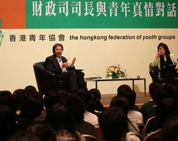 曾俊華在見面會開始之初就明確表示,歡迎學(xué)生發(fā)問任何問題,鼓勵他們切勿過分緊張!澳銈冇腥魏蜗敕,或者你們知道親戚朋友有什么看法,都盡管提出來。如果你們覺得預(yù)算案是稍為沉悶的話,你們可以提出其它比較有趣的話題!