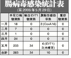 中新網(wǎng)5月30日電 據(jù)澳門日?qǐng)?bào)報(bào)道,澳門衛(wèi)生局29日再接獲10例腸病毒病例報(bào)告,截至29日中午,澳門今年累計(jì)錄得283個(gè)腸病毒(手足口病皰疹性咽峽炎)病例。接獲一例腸病毒聚集性感染個(gè)案。