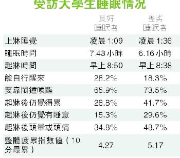 據(jù)香港明報(bào)報(bào)道,中大醫(yī)學(xué)院在06年2月至3月訪(fǎng)問(wèn)了400名中大學(xué)生了解其睡眠習(xí)慣和質(zhì)素,發(fā)現(xiàn)多達(dá)57.5%屬于“差劣睡眠者”(poor sleeper)。當(dāng)中女性更占65.7%,此班學(xué)生平均每晚到凌晨1時(shí)半才睡,近半數(shù)人起床后會(huì)感到頭暈或頭痛,四成起床后仍覺(jué)累,絕大多數(shù)均要靠鬧鐘喚醒。