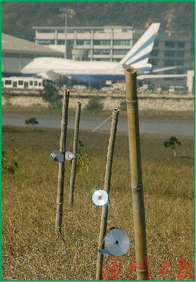 民署為免雀鳥在堆填區(qū)和淺灘覓食,到處亂飛而影響航班升降,18日上午派出工程人員在堆填區(qū)架設(shè)由回收光盤組成的反光裝置。該反光裝置由四片組成一個三角錐體,再以一條魚絲懸空吊在竹枝上,反光裝置可隨風(fēng)飄揚,將陽光向四周折射,干擾雀鳥活動,從而驚嚇雀鳥。