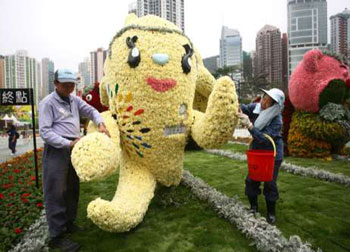 香港康文署主辦的2009香港花卉展覽由13日至本月22日在維園舉行。為配合迎接?xùn)|亞運(yùn)動(dòng)會(huì)的主題,現(xiàn)場(chǎng)放置用4萬株花卉嵌植成的大型展品“萬花喜迎東亞運(yùn)”,配合煙花、奧運(yùn)五環(huán)等花卉組圖,烘托出喜迎東亞運(yùn)動(dòng)會(huì)的氣息。