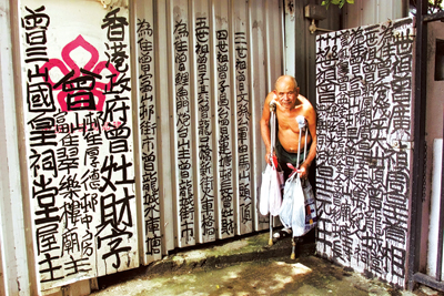 1999年“九龍皇帝”曾灶財與他的街頭書法。(葉英杰路透社)自稱“九龍皇帝”的曾灶財1921年生人,是香港著名的城市涂鴉藝術(shù)家。上世紀90年代,曾被路人發(fā)現(xiàn)于旺角街頭涂鴉,繼而被報道一舉成名,作品曾被拿到英國蘇富比拍賣行拍賣,F(xiàn)時在安老院養(yǎng)老。