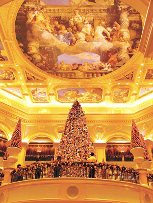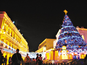 澳門的議事廳前地那一棵足有兩三層樓高的許愿樹燈飾會(huì)讓你眼前一亮,一層層藍(lán)盈盈小燈密密圍著,絲毫不會(huì)露出光裸電線,底下是制作頗為精細(xì)的大雪人,禮物堆,可愛(ài)得幾乎每個(gè)經(jīng)過(guò)的路人都忍不住要掏出手機(jī)去拍一張,小孩子更不用說(shuō)了,嚷嚷要媽媽放開手好讓他爬上去拆禮物,看得人忍不住要會(huì)心微笑。然后郵政局門口那一棵許愿樹也十分華麗,而且是很別出心裁地“長(zhǎng)”在了大門口,叫進(jìn)出的人都覺(jué)得自己是在天使庇佑之下似的,忍不住要在心里許個(gè)小小愿望。即使是在普通的非鬧市區(qū),馬路上也掛上了串串燈飾,顯得氣氛特別濃。至于各大娛樂(lè)場(chǎng)所里面的許愿樹,更是一棵賽一棵的漂亮,一層樓高的是小意思,兩層樓高的是普通規(guī)模,最夸張的是威尼斯人度假村,幾乎每隔一段距離就有一棵或大或小的許愿樹,上面還很細(xì)心地掛滿了蝴蝶結(jié)、許愿球、小禮物、小襪子……看得人又忍不住要掏手機(jī)來(lái)玩自拍,不過(guò)即使一棵一張,估計(jì)即使是512M的卡都會(huì)不夠用呢。