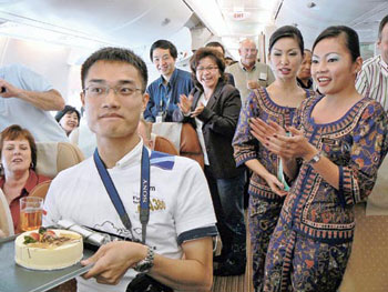 根據(jù)新加坡航空資料,約有10多名港人成為A380首航的見證人,當(dāng)中包括獨自登上航機的年輕人Francis Wu。昨日度過22歲生辰的Francis,正忙于以手提電腦輸入日志時,機組人員神秘地捧蛋糕走近,為他慶祝。其它乘客亦加入慶祝行列,一同拍掌唱生日歌,空姐亦特別送上生日卡,難怪Francis說:“今次是他人生中最好的一個生日。”在美國舊金山City College修讀計算機科技的Francis表示,數(shù)月前父母問他今年希望收到什么生日禮物時,他說希望可乘坐A380的首航,于是父母以1250美元(約9750港元)為他投得機票。