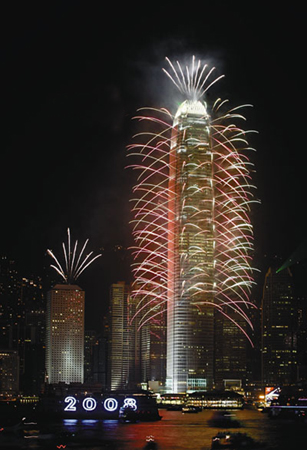 二十三時五十九分,行政長官曾蔭權(quán)在尖沙嘴文化中心啟動倒計時儀式。二00七年的最后二十秒,國金二期北面外墻兩側(cè)由三十二層起依次向上燃放焰火,火樹銀花照耀整個維港;合和中心、AIG大廈、長江集團中心及東企業(yè)廣場四棟大廈,外墻同時顯示倒計時時間,停泊在維港的滅火輪則向海面噴射多樣的水花……